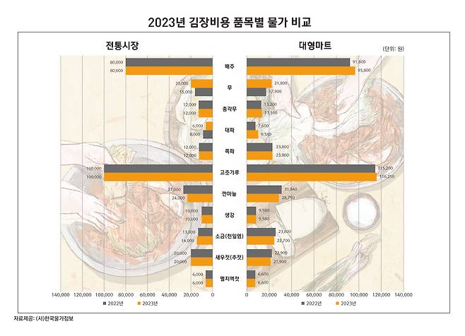 요즘 사람들이 김장을 하지 않는 가장 대표적인 이유로 손꼽히는 것은 바로 ‘비용’이다. 고물가 상황이 계속되면서 배추, 무, 고춧가루 등 김장 재료를 준비하는 데 만만치 않은 비용이 들어가기 때문이다. 그렇다면 2023년 올해 김장 비용은 얼마일까? 그리고 2022년에 비해서는 얼마나 올랐을까?