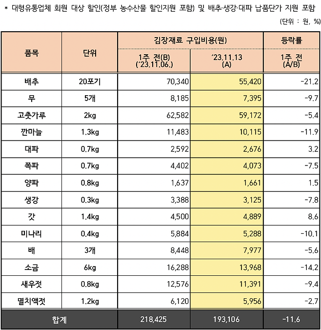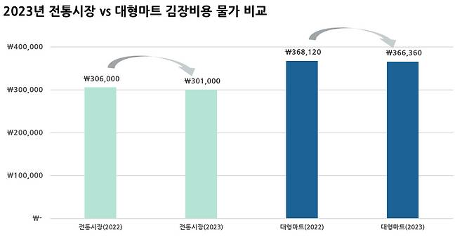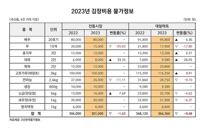 올해 4인 가족 김장 비용은 약 30만 원 안팎이다. 전문가격조사기관 한국물가정보가 11월 16일 발표한 자료에 따르면, 배추 20포기를 기준으로 국내산 김장 재료를 구입할 경우 전통시장에서는 301,000원, 대형마트에서는 366,460원이 들어간다. 이는 2022년 김장 비용에 비해 소폭 하락한 결과다.