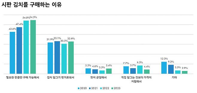 김장 김치보다 시판 김치를 선호하는 이유로는 ‘필요한 시기에 필요한 만큼 구매할 수 있어서’라는 답변이 54.5%로 과반에 달했다. 특히 포장김치의 맛과 종류가 다양해지면서 이 답변을 선택한 소비자는 점점 늘어나, 2020년 대비 무려 11.9%나 상승했다. 이후로는 ‘김치 담그기 번거로워서’라는 답변이 32.8%로 2위에 올랐으며, 여기서도 ‘직접 담그는 것보다 가격이 저렴해서’라는 답변은 4.4% 밖에 되지 않았다. 비용보다는 포장김치의 편의성이 우위를 차지한 것이다.