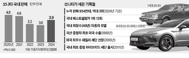 패밀리카의 대명사이던 쏘나타의 위상이 흔들리기 시작한 건 2017년부터였다. 그해 ‘베스트셀링카’ 자리를 그랜저에 내준 뒤 해를 거듭할수록 판매량이 줄었다. 소득 수준이 높아지며 ‘중산층이 타는 차량’이 그랜저로 한 등급 올라간 영향이다. 젊은 층을 중심으로 소득 수준에 비해 비싼 차를 구입하는 ‘카푸어’가 늘어난 것과 SUV 열풍이 분 것도 쏘나타 입지를 좁히는 데 한몫했다.