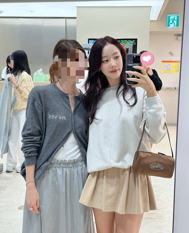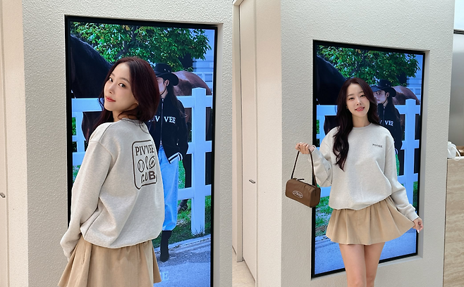 그녀는 넉넉한 실루엣의 연회색 스웨트셔츠에 베이지 컬러의 플리츠 미니스커트를 매치해 경쾌하면서도 사랑스러운 룩을 연출했습니다.