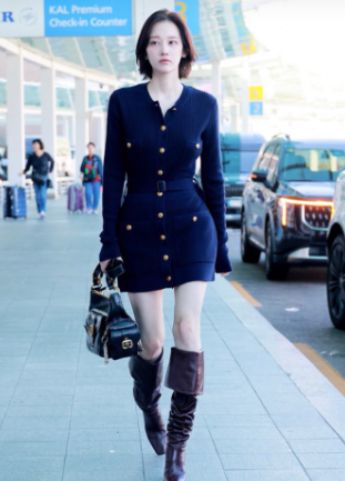 안그래도 잘록한 허리에 벨트로 한 번 더 허리라인을 강조하고 브라운 롱부츠를 매치하여 시크한 니트 원피스 코디를 완성했다.