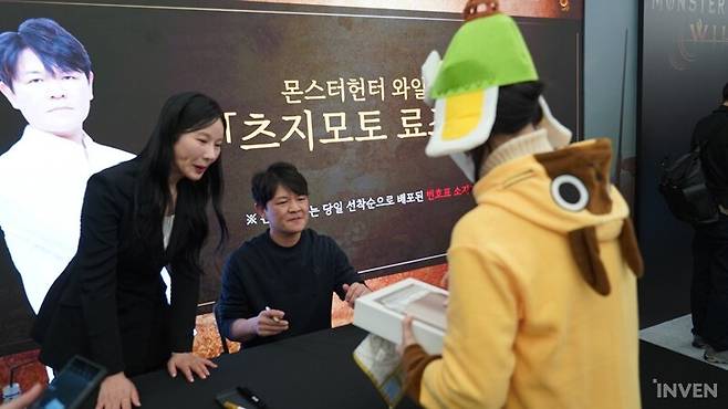 물론 이날 이벤트 현장을 방문한 유저들의 진짜 목적은 따로 있었습니다. 바로 츠지모토 료조 PD와의 사인회입니다. 선착순으로 진행된 이날 사인회에 참가하고자 새벽 1시부터 온 유저도 있을 정도였는데요. 최애 몬헌 패키지 케이스부터 몬스터 헌터 와일즈 스틸북, PS 포탈, 듀얼센스 등 몬헌과 관련된 온갖 물건들이 등장해 츠지모토 료조 PD의 만면에 미소를 띠게 했던 이날 이벤트 현장 모습을 사진으로 담았습니다.