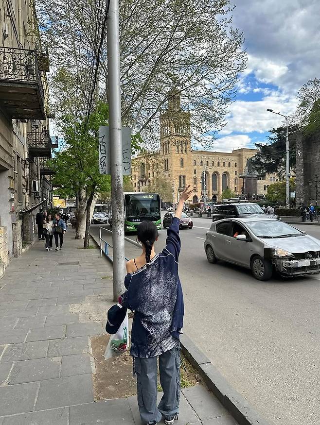 있지 리아가 영화보다 더 영화 같은 스트리트 룩으로 시선을 사로잡았다. 도시의 분주한 도로변에서 손을 번쩍 든 그녀의 뒷모습은 마치 힙합 뮤직비디오의 한 장면처럼 강렬하다. 특히 한쪽 어깨를 훌쩍 내린 오버핏 니트는 과감한 워싱 디테일이 돋보이는 디자인으로, 데님 텍스처를 연상케 하며 빈티지 무드를 극대화했다.