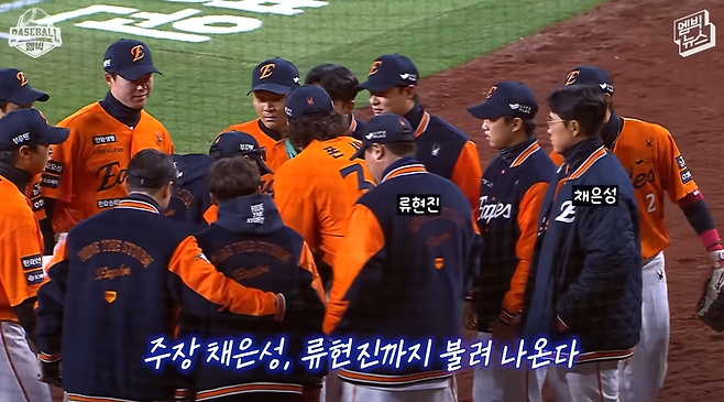 그러자 갑자기 선발 투수(고봉세)가 돌발 행동을 한다. 7회 마운드를 내려오면 서다. “다들 모여봐.” 손짓이 무척 절실하고, 격렬하다. 덕아웃의 동료들까지 불러낸다. 얼떨결에 주장 채은성과 류현진까지 나가야 했다.