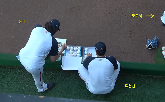류현진이 그러는 건 이해가 간다. 곁에 있는 폰세의 모습은 흔치 않은 광경이다. 외국인 투수 아닌가. 쉬라고 며칠 말미를 줬는데. 그걸 마다하고, 굳이 불펜까지 들어온다. 상황이 이러니 라이언 와이스도 가만히 있을 수 없다. 이것저것 거들며 함께 한다.