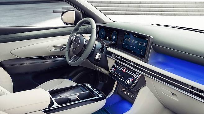 이번 투싼 풀체인지의 가장 큰 화제는 실내 공간을 지배하는 대형 파노라믹 디스플레이다. 현행 모델의 분리형 디스플레이와는 차원이 다른 16:9 비율의 와이드 통합 디스플레이가 운전석 전체를 감싸는 형태로 적용된다. 이는 테슬라의 미니멀리즘 철학을 연상시키는 구성으로, 물리 버튼을 최소화하고 터치 기반의 직관적인 인터페이스로 전환한 것이 특징이다.