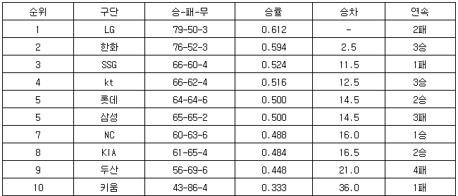 [프로야구 중간순위] 13일
