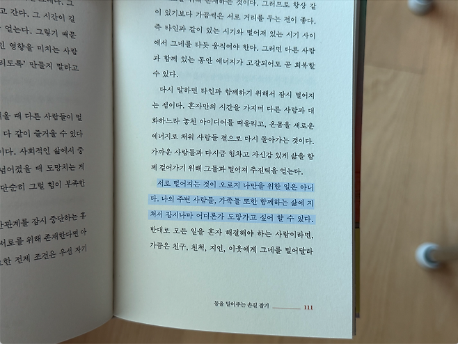 『삶으로 다시 날아오르기』에서는 이렇게 말한다. “서로 떨어지는 것이 오로지 나만을 위한 일은 아니다. 나의 주변 사람들, 가족들 또한 함께하는 삶에 지쳐서 잠시나마 어디론가 도망가고 싶어 할 수 있다.” 필요할 때 거리를 둘 줄 아는 사람이 결국 더 오래, 편안하게 관계를 이어간다.