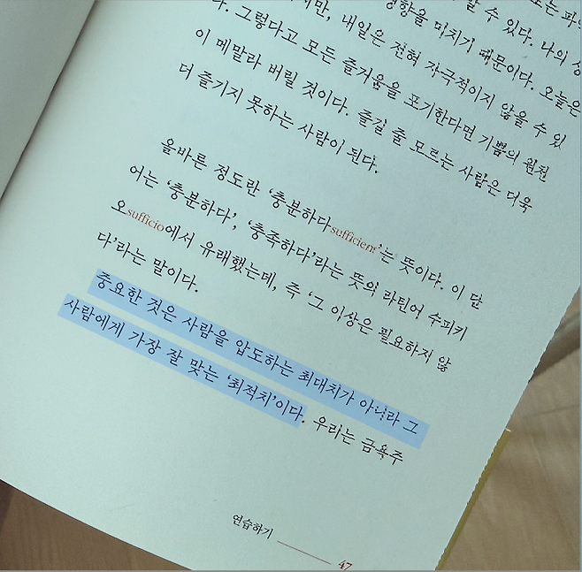 남들과 비교하지 않고, 자신에게 맞는 속도와 기준을 알고 살아간다. 빌헬름 슈미트는 『삶으로 다시 날아오르기』에서 이렇게 말한다. “올바른 정도란 ‘충분하다는 뜻이다. 중요한 것은 사람을 압도하는 최대치가 아니라 그 사람에게 가장 잘 맞는 ‘최적치’이다.”