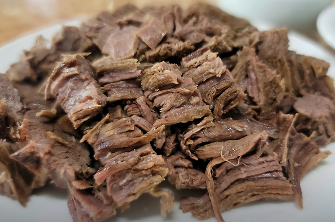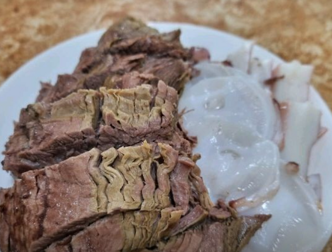 ▶ 양지 수육방송의 주인공 메뉴. 젓가락으로 집기만 해도 결이 자연스럽게 풀어질 정도로 부드럽고, 잡내 없이 담백합니다. 과한 간 없이 고기 본연의 맛이 살아 있습니다.