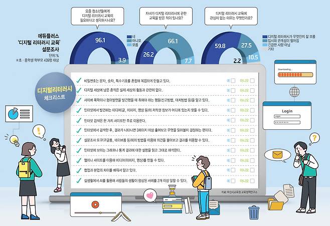 에듀플러스는 4월 7일부터 9일까지 초·중학교 학부모 439명 대상으로 디지털 리터러시 교육 관련 설문 조사를 실시했다. 가장 눈에 띄는 결과는 디지털 리터러시 교육의 필요성에 대한 답변이다. 응답자 96.1%가 청소년에게 디지털 리터러시 교육이 필요하다고 답했다.