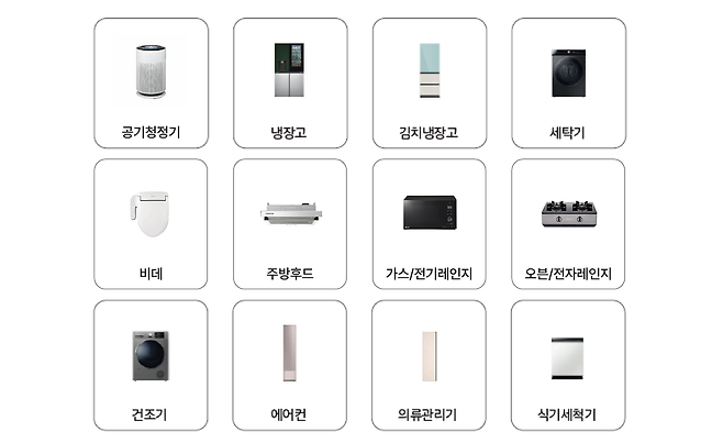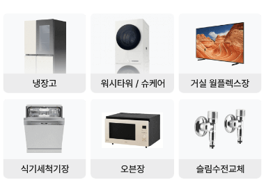 공기청정기, 냉장고, 김치냉장고, 세탁기, 비데, 주방 후드, 가스/전기레인지, 오븐/전자레인지, 건조기, 에어컨, 의류관리기, 식기세척기까지 집에서 사용하는 대부분의 가전은 문제없이 서비스받을 수 있어요.