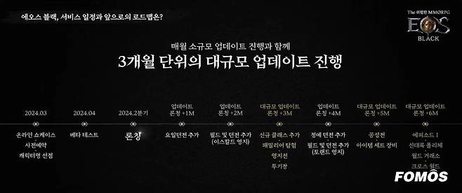 론칭 이후에는 3개월 단위로 대규모 업데이트가 진행될 예정이다. 론칭 3개월 뒤 신규 클래스와 패밀리어 탐험, 영지전, 투기장이 추가될 예정이며 6개월 뒤에는 새로운 에피소드와 신대륙, 월드 거래소 등이 업데이트 예고됐다.