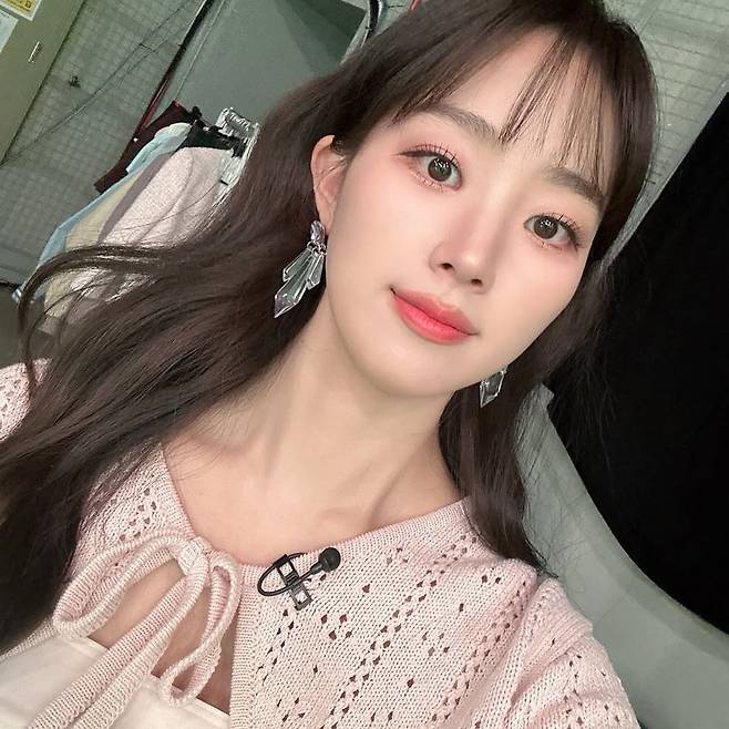 또 하나 눈에 띄는 아이템은 바로 주시은의 귀걸이. 크리스탈 조각을 엮은 듯한 샹들리에 형태의 드롭 이어링이 얼굴선을 더욱 갸름하게 만들어주며, 전체 룩에 고급스러움을 더했다. 긴 웨이브 헤어는 부드러운 여성미를 강조하면서도 얼굴형에 자연스럽게 어우러져 완벽한 셀피룩을 완성했다.