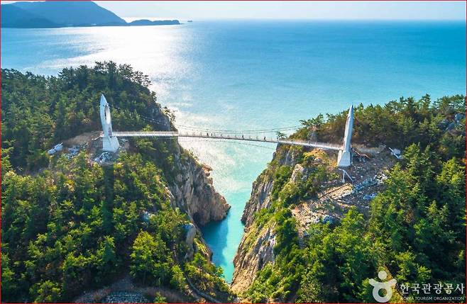 이 길의 백미는 바로 70m 높이의 출렁다리 ‘꽃섬다리’입니다. 기암절벽을 잇는 이 다리는 걷는 이의 발끝을 긴장시키며, 깊은 바다와 절벽 아래 용굴이 드러나는 순간 짜릿함을 선사합니다. 다리를 지나면 조용한 산책길과 함께 ‘애림 민 야생화공원’이 이어지며, 이름 그대로 다양한 야생화가 반겨줍니다.