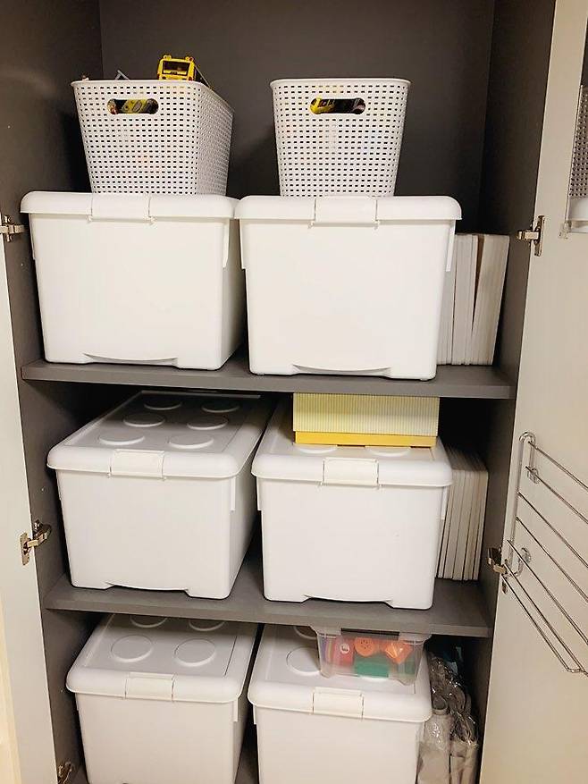 아이 방 붙박이 장안에는 리빙박스를 이용해 유아 용품과 사무 용품을 한 곳에 정리해 찾기 쉽게 구분해 놓았어요.