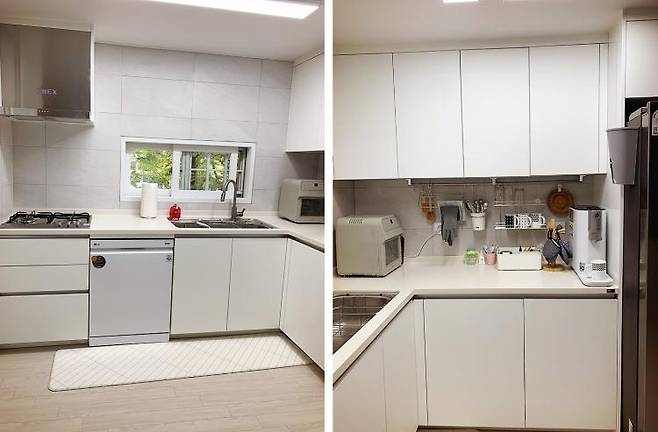 창문 앞쪽에 에어프라이어는 생선이나 고기 냄새가 바로바로 빠지게 해 주고, 새로 장만한 식기세척기는 설거지가 쌓이지 않게 바로바로 열 일 해주는 효자템입니다.
