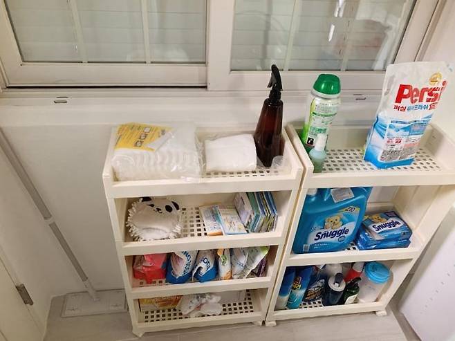 뒤쪽 베란다에 기저귀와 물티슈, 화장지 등 생필품을 한방에 해결할 수 있는 공간으로 쓰고 있습니다.