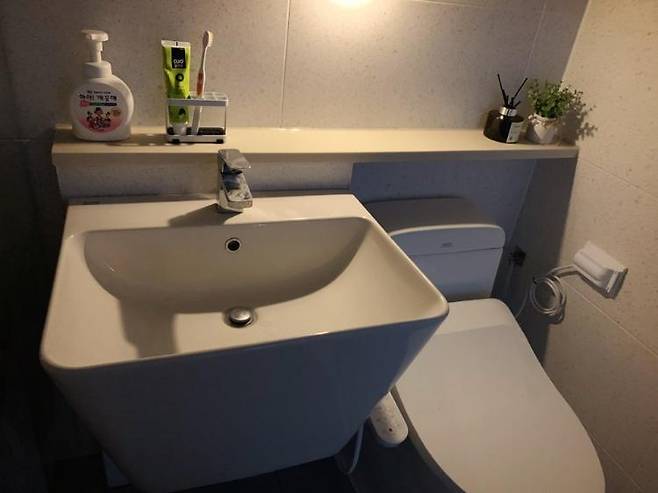 안방 욕실은 더욱 아담해요.주로 낮엔 공용욕실을 사용하고 밤에만 사용하기 때문에 많은 용품을 비치해두지 않고 쓰고 있습니다.