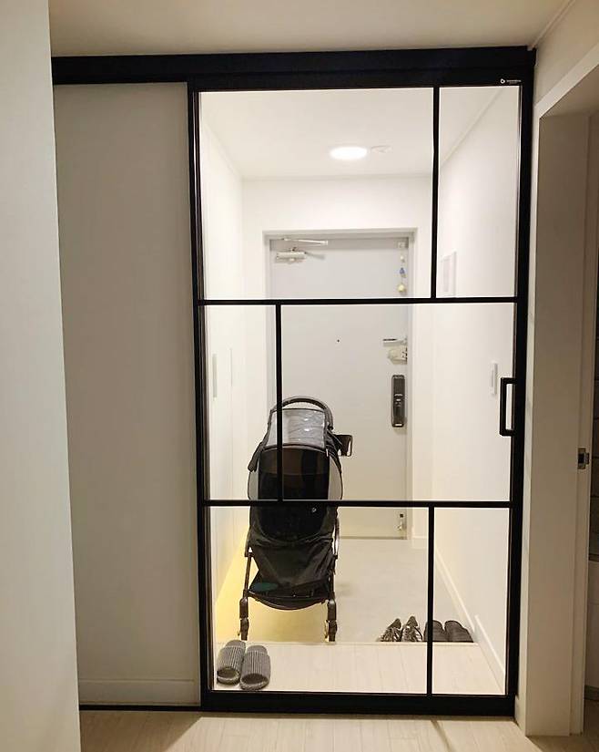 현관문을 열면 바로 보이는 슬라이딩 유리 중문이에요.저희 집의 모던한 분위기와 잘 맞는 프레임을 선택했어요.