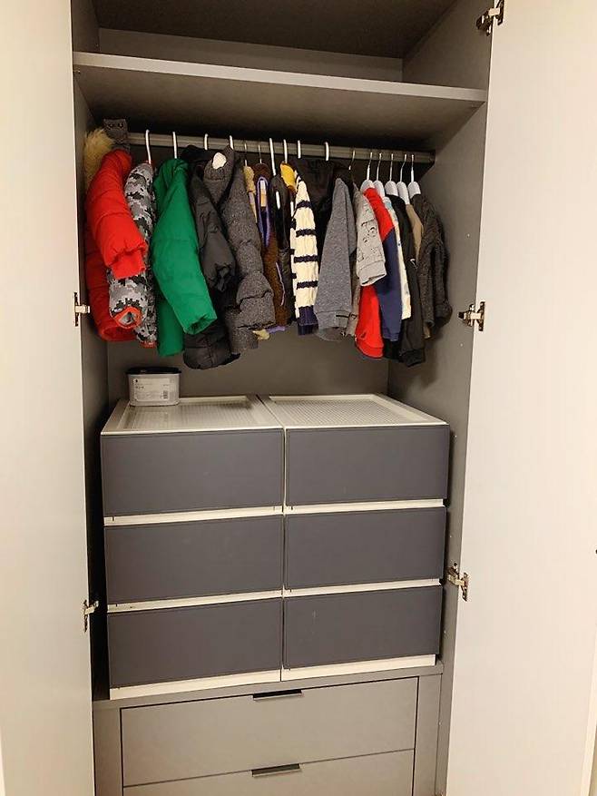 아이 옷장에 겉옷은 걸어두고 서랍에는 종류를 구분해서 정리했어요.