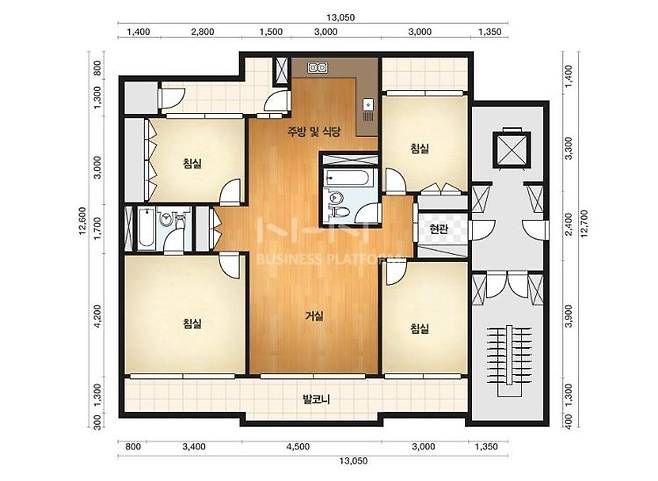 20년 된 아파트 42평형 계단식 구조의 도면입니다. 한 번도 리모델링한 적 없는 옛날식 구조의 40평 대예요.