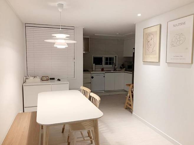 어두운 컬러가 집을 좁아 보이게 해 화이트톤으로 컨셉을 잡고 환하고 넓어 보이게 인테리어를 진행했어요.