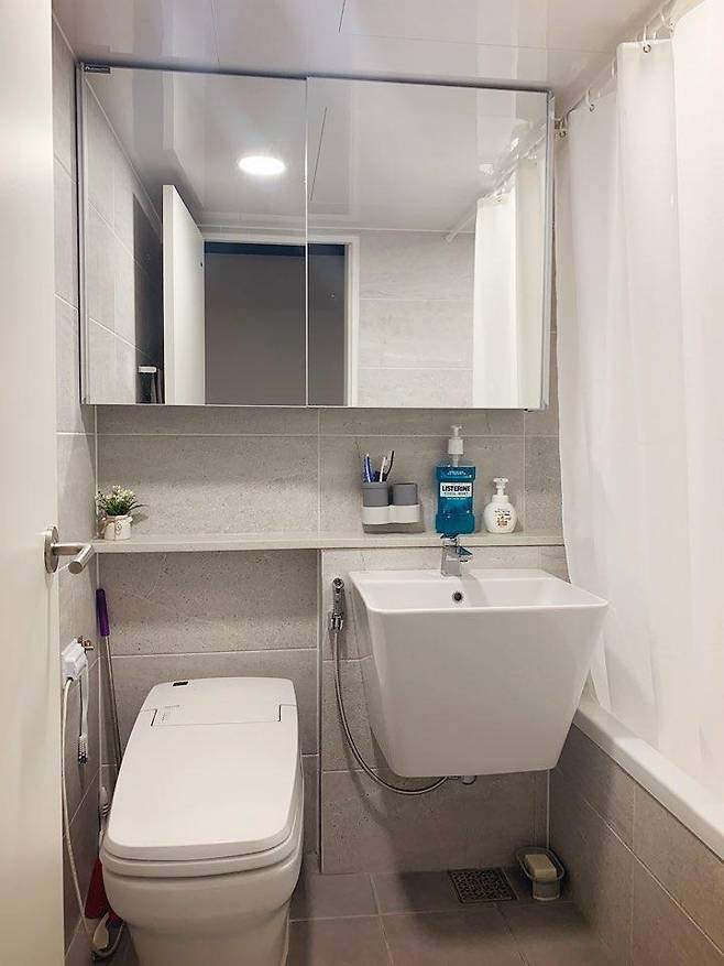 공용욕실은 밝은 그레이 톤이에요.세면대와 변기 욕조 슬라이드 장 모두 플랫 스타일로 통일했어요.