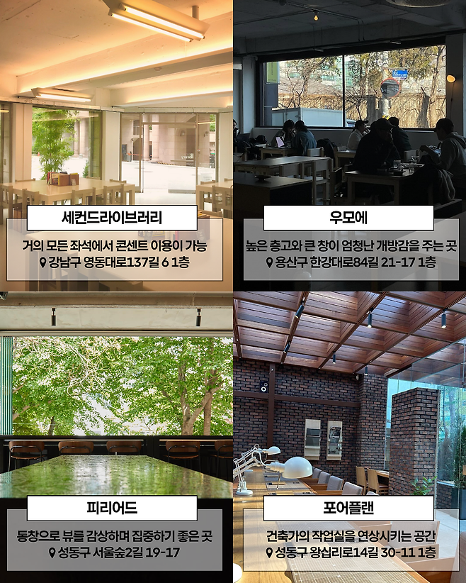 📍피리어드ㅣ성동구 서울숲2길 19-17초록초록한 통창을 통해 뷰를 감상하며 작업에 집중할 수 있어요.