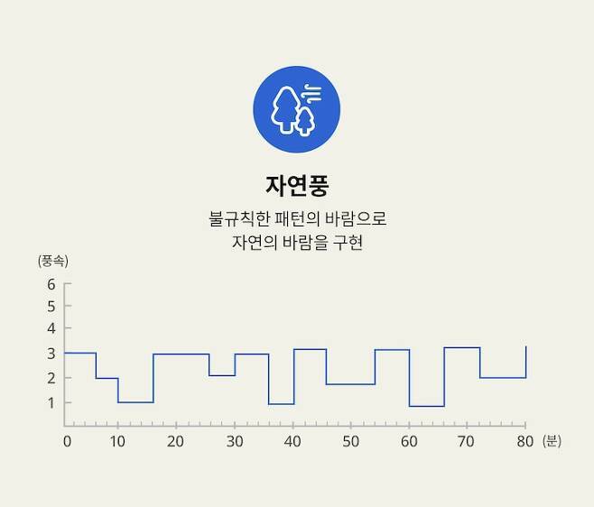 BLDC 선풍기의 자연풍은 바로 그런 문제를 해결해줘요! 실제 자연 바람이 부는 것처럼 풍속을 알아서 랜덤하게 올리고 낮춰주거든요.