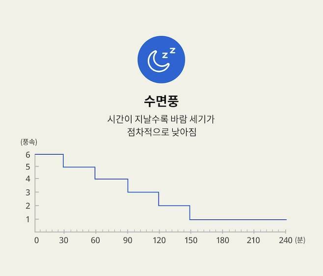 내가 설정한 시간에 도달할 때까지 일정한 간격으로 풍속을 스스로 낮춰주는 기능이거든요. 예를 들어, 수면풍 모드로 4시간을 설정해두면 30분마다 한 단계씩 풍속을 낮춰주는 식이죠!