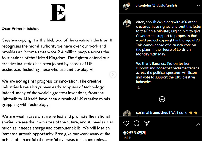 이들은 스타머 영국 총리에게 보내는 공개서한에 "저작권을 제대로 보호하지 못하면 아티스트의 작품을 기술 회사에 넘겨주는 것과 같다"라며 정부가 추진해 온 '데이터 법안' 수정을 촉구했다.