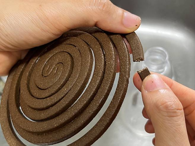 물에 적신 모기향을 소량씩 부러뜨려서 분무기 안에 넣으세요. 물에 적당히 젖은 모기향은 가루가 많이 발생하지 않고 깔끔하게 부러집니다.