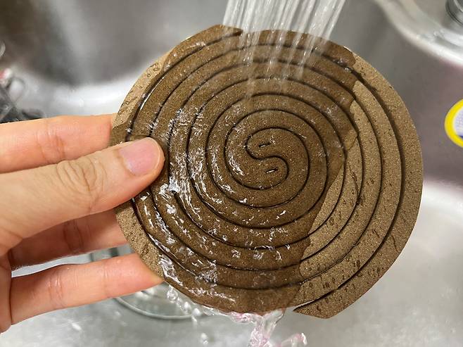 먼저 모기향을 한 개 꺼낸 다음 물에 충분하게 적셔 주세요.