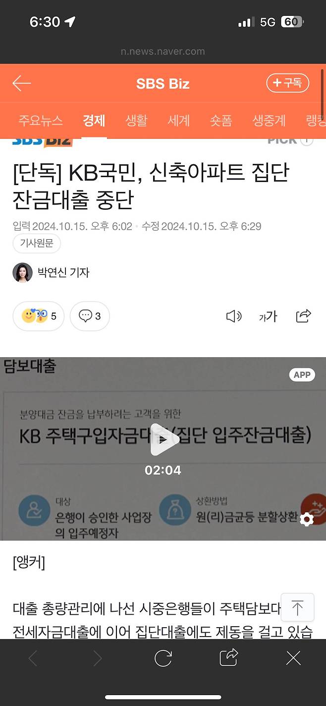 [단독] KB국민, 신축아파트 집단 잔금대출 중단