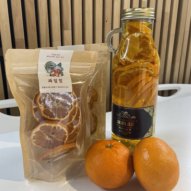 직접 재배한 감귤로 매장에서 건조, 포장을 거쳐 저렴한 가격으로 감귤과 감귤칩을 판매하는 속숨한제주는 제주의 맑은 공기와 햇살을 품은 자연 그대로의 싱싱하고 달달한 귤맛을 전달합니다. 감귤칩을 맛있게 즐기는 방법으로는 감귤칩 2~3개를 넣고 뜨거운 물로 우려낸 감귤차, 설탕과 술을 담아 30일 후에는 비타민이 풍부한 상큼한 담금주, 손이나 믹서기로 분쇄해 우유, 요거트, 아이스크림 등의 토핑으로 즐길 수 있습니다.
