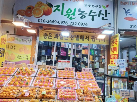 지원농수산은 사랑이 넘치는 부부가 운영하는 농수산물 및 제주기념품 가게입니다. 연중무휴 매일 6시면 가게 문을 여는 지원농수산은 동문시장의 새벽을 여는 몇 안되는 가게 중 하나입니다. 서울에서 제주로 넘어오며, 서로에게 의지를 많이 하며 지내온 여사장님은 아직도 남편을 ‘곰탱이‘라는 애칭으로 부르곤 하신다고 합니다. 제철과일🍊과 제주여행기념품이 필요하다면 친절한 미소로 손님을 맞이하시는 지원농수산에 들려보면 어떨까요?!