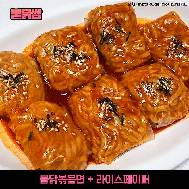 너무 간단한 방법의 불닭쌈. 유튜브 등 많은 SNS에서 열풍을 일으킨 레시피예요. 라이스페이퍼의 쫀쫀함과 만나 쫄깃쫄깃하고 맛있다고 해요. 치즈를 좋아하면 쌈 안에 치즈를 넣어서 전자레인지에 30초 정도 돌려먹으면 완젼 굳!