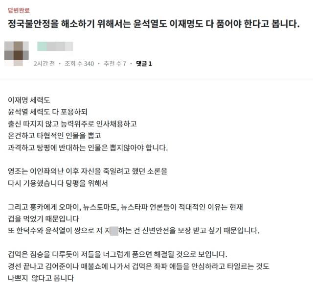글에서는 "이재명 세력도, 윤석열 세력도 다 포용하되, 출신 따지지 않고 능력 위주로 인사채용하고, 온건하고 타협적인 인물을 뽑고, 과격하고 탕평에 반대하는 인물은 뽑지 않아야 한다"면서 탕평책으로 유명한 조선 왕 영조를 소환, "영조는 이인좌의 난 이후 자신을 죽일려고 했던 소론을 다시 기용했다. 탕평을 위해서"라고 역사적 사례도 소환해 향후 국정 운영에 대해 제안했다.