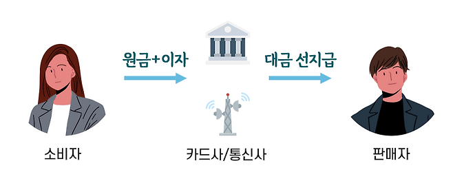 카드사(통신사)에 빚을 지고, 그 빚을 나눠서 갚는 것이에요. 결국 휴대폰을 쓰면서 매달 통신사에게 빚을 갚고 있는 거예요. 통신료와 함께 휴대폰 값 + 이자를 함께 갚는 거예요.
