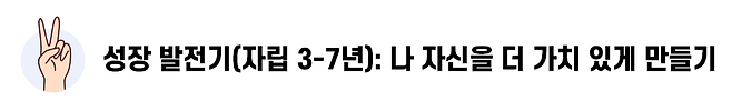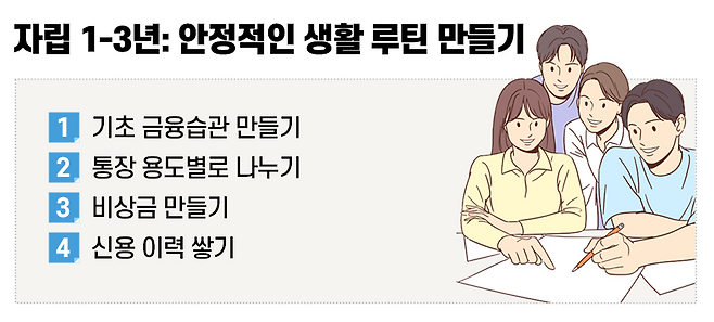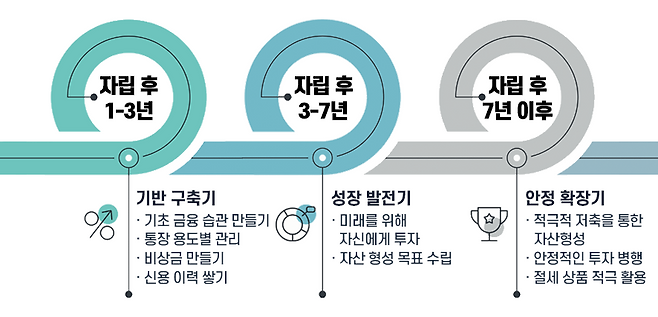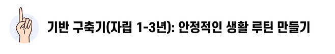 자립하고 나서 5년이 정말 중요한 골든타임이에요. 특히 처음 1~3년은 ‘안정적으로 살아남기’가 가장 우선이죠. 살아남기라고 하니까 좀 무겁게 들릴 수 있지만, 쉽게 말해서 나만의 안정적인 생활 패턴을 만드는 시기라고 생각하면 돼요. 자립 3~7년 후는 자신의 발전을 위해서 노력하는 성장발전기이고, 7년 이후는 안정적인 자립을 위한 안정 확장기라고 할 수 있죠.
