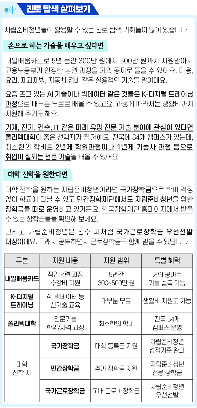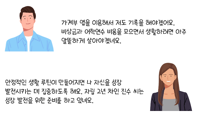 진수 씨는 근로장학생과 자립수당, 그리고 학업을 통해 본인의 생활 루틴을 잘 만들고 어학연수라는 목표를 위해 알뜰하게 살겠다고 다짐한 거잖아요. 이렇게 자립 3~7년 사이에는 자신의 발전을 위해 노력하는 시기입니다.