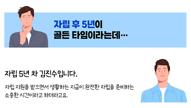 자립 후 5년 동안은 지원제도의 혜택을 받으며 나에 대해서 알고, 미래에 어떤 사람이 될지 목표를 세우고, 그에 맞는 바람직한 생활 습관을 만들 수 있어서 골든타임이라고 하는 거예요. 이 골든타임을 현명하게 보내야 자립 생활이 안정될 수 있거든요.