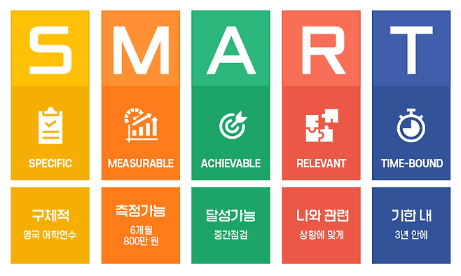 그리고 꼭 시한을 명시하세요. '3년 안에'와 같이 목표 시한을 정해 놓으면 그 기간 내에 목표를 달성하기 위해 더 노력할 수 있습니다. 여기서 중요한 것은 중간 점검을 언제 할지도 함께 설정하는 것입니다. 3년 목표라면 1년마다 점검일을 정해서 계획을 수정·보완한다면 목표 달성 가능성이 훨씬 높아집니다. 이렇게 목표를 구체화하는 것을 SMART 법이라고 부릅니다.