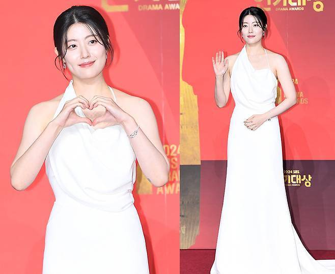 남지현은 드레이프 디테일이 돋보이는 화이트 홀터넥 드레스로 세련되고 우아한 레드카펫 룩을 완성하며 고급스러운 분위기를 자아냈습니다.