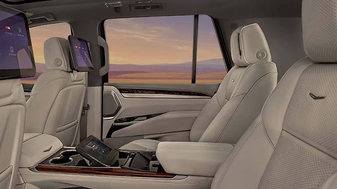 무거운 도어를 열고 실내로 들어서는 순간, 과거 미국차 특유의 투박함은 흔적도 없이 사라지고 시야를 완벽하게 압도하는 거대한 '디지털 파노라마'가 탑승객을 맞이한다. 운전석부터 조수석 끝까지 대시보드 전체를 시원하게 덮어버린 55인치 커브드 LED 디스플레이는 이 차의 하이라이트다.