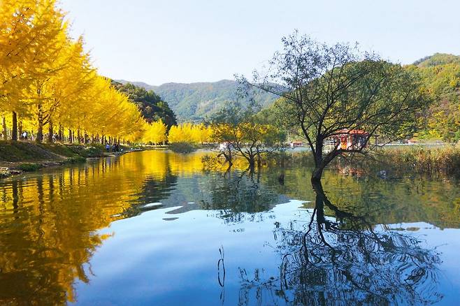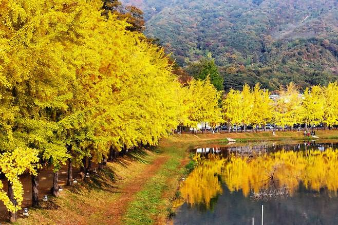 충북 괴산의 문광저수지는 은행나무로 둘러싸인 저수지가 있다. 저수지 주변 약 2km 길을 따라 200여 그루의 은행나무가 심어져 있다. 가을이면 노랗게 물든 은행잎이 장관을 이룬다. SNS 포토스팟으로도 유명한데, 이유는 저수지의 맑은 물에 비친 은행나무의 모습이 그림처럼 예쁘기 때문이다. 덕분에 '동백꽃 필 무렵'과 '더킹: 영원의 군주' 등 여러 드라마 촬영지로도 소개됐다. 은행나무길의 절정 시기는 10월 중순부터 11월 중순까지다. 이 시기에 방문하면 가장 아름다운 풍경을 감상할 수 있다. 결혼해서 아이가 있다면 더욱 추천한다. 문광저수지 인근에는 소금랜드, 소나무공원, 야생화공원, 햇살광장, 어린이놀이터 등 다양한 시설이 있어 가족 방문객들도 많이 찾는다.