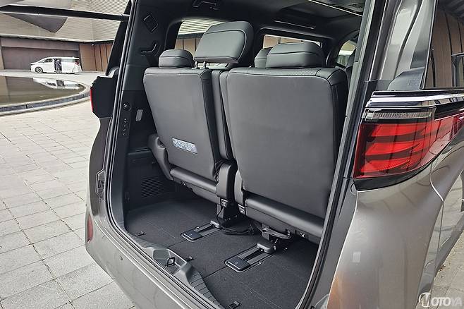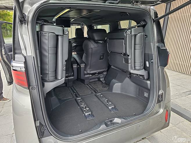 3열 좌석은 접어서 짐공간을 늘리는 데에도 활용할 수 있는데, 접히는 방식이 독특하다. 기아 카니발이 사용하는 스토우 앤 고(싱킹시트) 방식도 아니고, 옛 미니밴들처럼 더블폴딩이나 팁업 방식도 아닌, 오래된 SUV에서나 볼 법한 5:5 좌우 분할 접이식을 적용하고 있기 때문이다. 좌석을 위쪽으로 올려 접은 후에 벨트로 고정하는 방식인데,, 힘이 조금 들어가는 편이기는 하지만 시트를 바닥에 수납하는 것 못지않게 광활한 공간을 만들어낼 수 있다. 심지어 트렁크의 바닥면조차 상당히 낮은 덕분에, 이쪽으로 승하차가 가능할 정도다. 3열좌석을 접게 되면 골프백 4개를 세워서 싣고노 한참 남을 정도의 넓은 공간이 조성되며, 트렁크룸 바닥 아래에도 추가적인 수납공간이 마련되어 있다.
