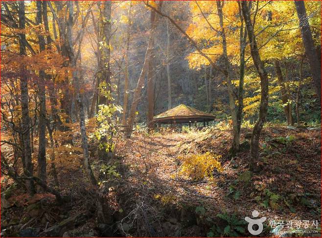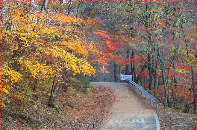 방태산의 가을은 유난히 풍성합니다. 휴양림 입구에서 계곡을 따라 걷는 산책길은 약 1시간 남짓이지만, 그 시간 동안 단풍의 빛과 숲의 향, 그리고 물소리가 어우러져 가을의 정수를 느끼게 하지요. 붉게 물든 단풍잎 사이로 햇살이 비치면 숲은 황금빛으로 빛나고, 계곡물 위로 흩날리는 낙엽은 마치 가을이 춤추는 듯합니다. 이 길을 따라 걷다 보면 마음이 저절로 천천히 쉬어갑니다.
